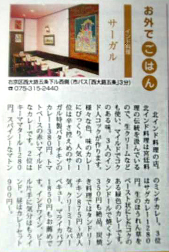 京都食いしんぼうの会(主宰・小山晶之さん)から『京都は世界の食の都 定番にしたい 異国料理店』が発行されましたが、インドレストラン・サーガルが取り上げられています。
