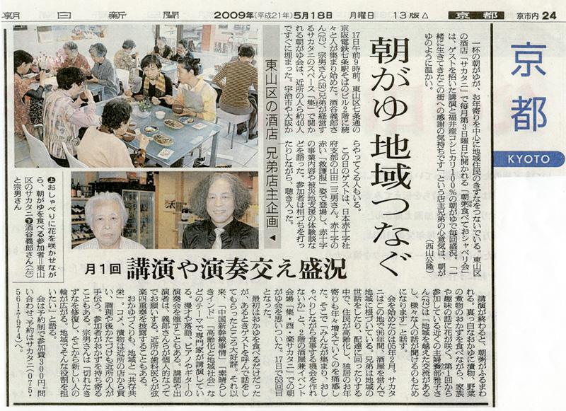 税金なんでも相談・早川嘉美スケッチ展・早川加代子人形おにんぎょう大好き展の会場としてすっかりおなじみの集酉楽サカタニの「朝粥食べておシャベリ会」が、朝日新聞に大きく報道されました。
