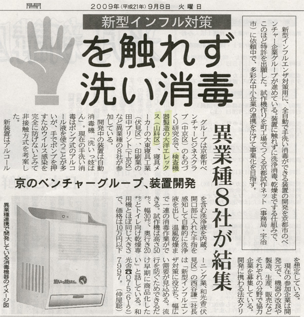 検査機器で独自路線をいく大洋エレックスらが中心となった異業種グループが「新型インフル対策 手を触れずに手洗い消毒機器」を開発して話題になっています。