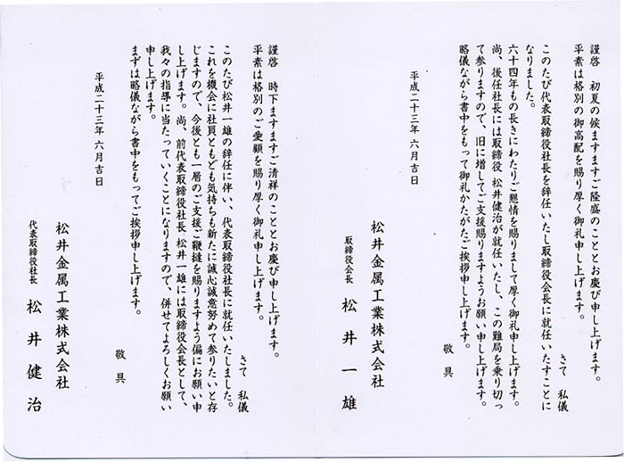 (110)松井金属工業株式会社 新社長に松井健治氏 松井一雄氏は会長に就任