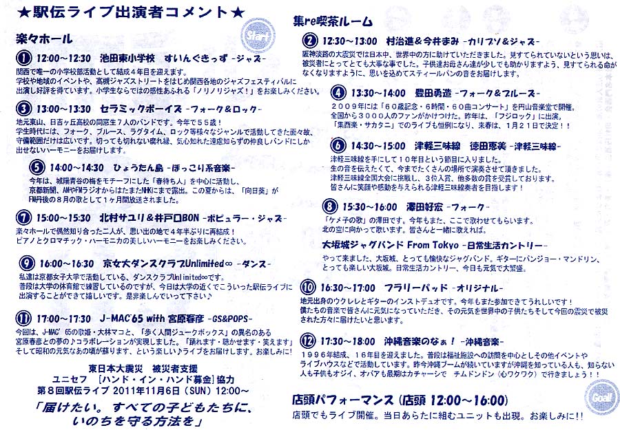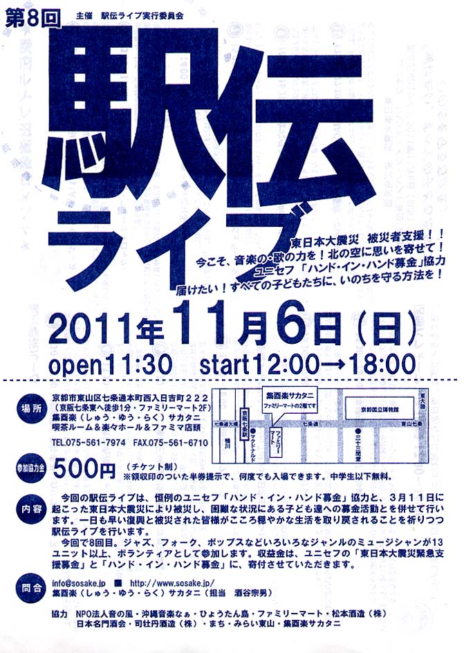 今回で8回目。ジャズ、フォーク、ポップスなどいろいろなジャンルのミュージシャンが13ユニット、ボランティアとして参加します。収益金は、ユニセフの「東日本大震災緊急支援活動支援金」と「ハンド・イン・ハンド募金」に、寄付させていただきます。(案内リーフレットより)