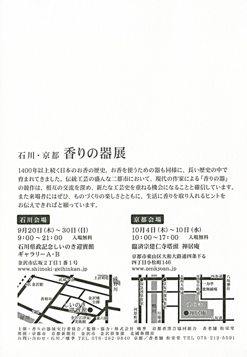 1400年以上続く日本のお香の歴史。お香を使うための器も同様に、長い歴史の中で育まれてきました。伝統工芸の盛んなニ都市において、現代の作家による「香りの器」の競作は、相互の交流を深め、新たな工芸史を重ねる機会になることを確信しています。また来場者にはぜひ、ものづくりの楽しさとともに、生活に香りを取り入れるヒントをお伝えできればと願っています。