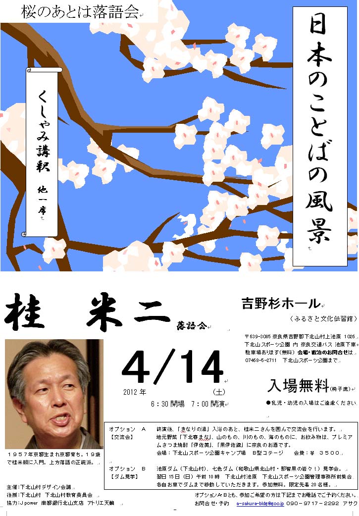 新春セミナーに連続登場いただいている米二師匠が、同席されていた朝倉泰子さん(朝倉コンサート企画主宰)の仕掛けに乗って、遠く奈良県下北山村に出かける落語会が実現しました。