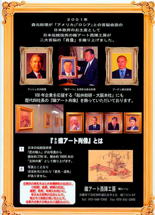 匠の職人が写真から縦糸約2700本、横糸10000本の”立体の美”として織り上げられます。写真と異なり「変色・退色」がないのが特長。