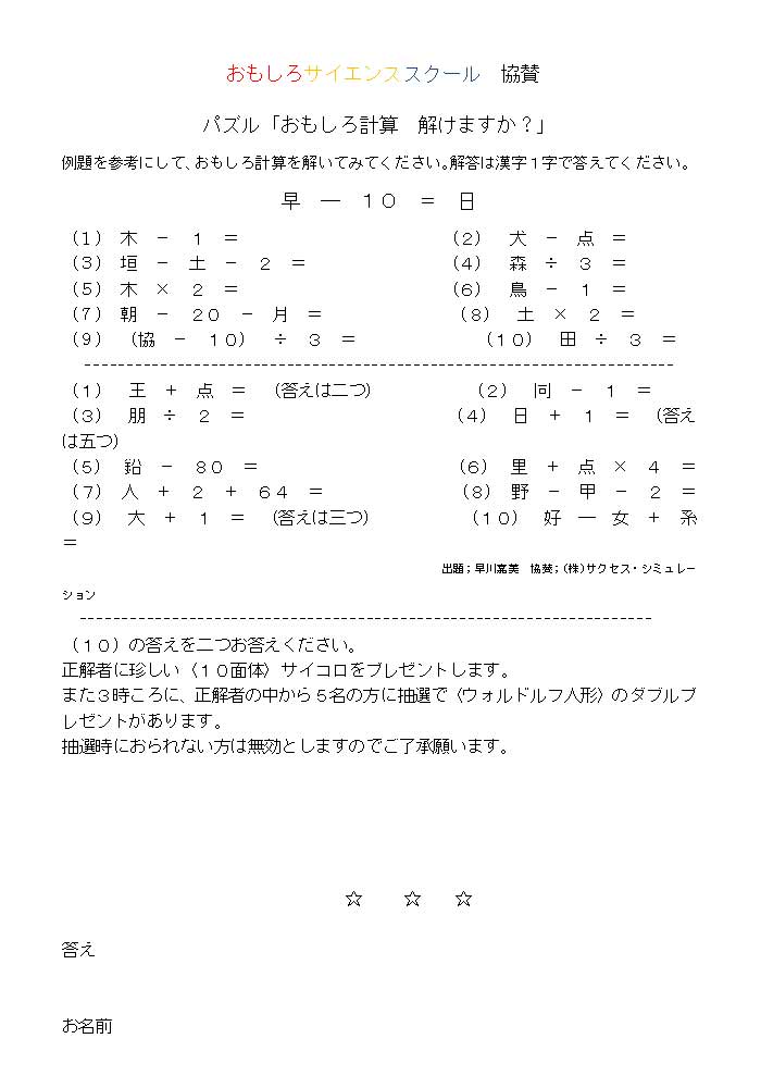 ・早川の協賛出展のパズル「おもしろ計算 解けますか?」