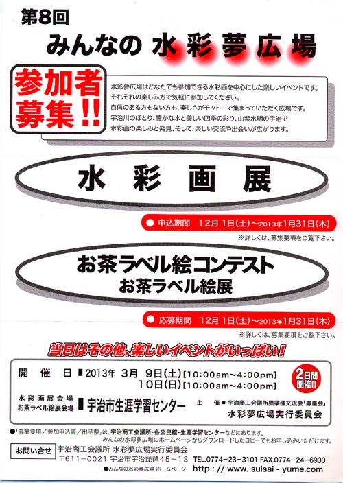 第8回みんなの水彩夢広場(宇治市)は3月9日(土)ー10日(日)、宇治市生涯学習センターで催されますが、これに先立ち参加者を募集しています。