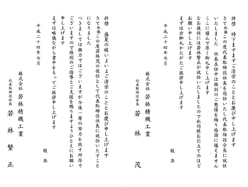 当事務所の研修・親睦組織である「よしみ会」代表幹事を永年にわたって務めていただいている若林茂若林精機工業社長は、このほど開かれた株主総会で会長に就任、新社長に若林繁正氏を選任した。