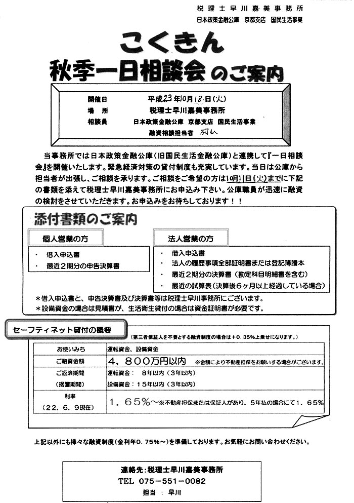 当事務所では日本政策金融公庫(旧国民金融公庫)と連携して「一日相談会」を昨年に引き続いて開催することになりました。