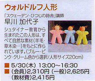 5月30日(木)NHKカルチャー(梅田校)でウォルドルフ人形の1日講座があります。